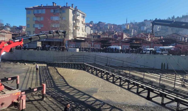 Kastamonu'nun İnebolu ilçesinde 2,5 yıl önce sel sularına kapılan üst geçit yeniden inşa edilerek yerine yerleştirildi. Vatandaşlar, vinçlerle ilçeyi bölen çaya yerleştirilen üst geçidi meraklı gözlerle izledi.