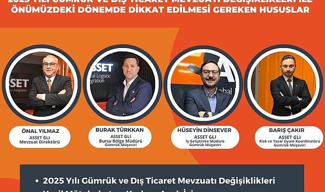 Asset Global Logistic Integration (GLI) ve NOSAB iş birliğiyle düzenlenen etkinlik, 15 Ocak Çarşamba günü, 13.30-16.30 saatleri arasında, NOSAB Yalçın Aras Konferans Salonu'nda gerçekleştirilecek. Konferansta, mevzuat değişikliklerinin yanı sıra yeşil mutabakat ve karbon ayak izi ile tedarik zincirinde maliyet azaltıcı gümrük uygulamaları masaya yatırılacak. Etkinlikte Asset GLI Mevzuat Direktörü Önal Yılmaz, Bursa Bölge Müdürü Burak Türkkan, İş Geliştirme Müdürü Hüseyin Dinsever ile Risk ve Yasal Uyum Koordinatörü Barış Çakır konuşmacı olarak yer alacak. Katılımcılar, güncel mevzuat değişiklikleri hakkında bilgi edinme fırsatı bulurken, dış ticaret ve lojistik süreçlerinde yeni stratejiler geliştirme imkanı yakalayacak.