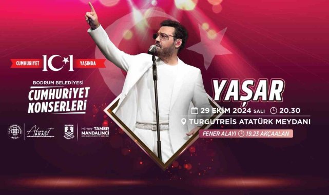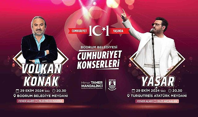 29 Ekim Cumhuriyet Bayramı'nda, Bodrum Kaymakamlığı, Muğla Büyükşehir Belediyesi ile Bodrum Belediyesi iş birliğinde etkinliklerle Bodrum merkez ve Turgutreis'te halk, bayram coşkusunu yaşayacak.Cumhuriyet'in 101. yıl dönümü kutlamaları kapsamında, 28 Ekim Pazartesi günü saat 13.00'te Bodrum Belediye Meydanı Atatürk Heykeli önünde Bodrum Kaymakamlığı tarafından hazırlanan çelenk sunma programı gerçekleşecek. 29 Ekim Salı günü ise 10.30'da Bodrum Kalesi Kuzey Hendeğinde kutlama programı düzenlenecek.Muğla Büyükşehir Belediyesi ve Bodrum Belediyesi organizasyonuyla 29 Ekim Salı günü 19.23'te Bodrum merkez ve Turgutreis'te eş zamanlı yapılacak fener alayı ve ardından konser etkinliklerinde Bodrum yaşayanları coşku dolu anlara şahitlik edecek.Bodrum'da "Volkan Konak" coşkusuBodrum Belediyesi tarafından hazırlıkları yapılan etkinlikler kapsamında 29 Ekim Salı günü 19.23'te Milta Bodrum Marina'dan Bodrum Belediye Meydanı'na Fener Alayı yürüyüşü yapılacak ve akabinde Bodrum Belediye Meydanı'nda ünlü sanatçı Volkan Konak, Cumhuriyet coşkusunu Bodrum halkıyla paylaşacak.Turgutreis Mahallesi'nde "Yaşar" sevinciBodrum'un Turgutreis Mahallesinde de 29 Ekim Salı günü fener alayı ve konser etkinliği gerçekleşecek. Akçaalan Düğün Salonu önünden 19.23'te başlayacak ve Turgutreis Atatürk Meydanı'na kadar sürecek olan Fener Alayı sonrası Muğla Büyükşehir Belediyesi tarafından hazırlanan program kapsamında Türk pop müziğinin unutulmaz ismi Yaşar, sevenleriyle buluşacak.Cumhuriyet Bayramı kutlamaları kapsamında Bodrum Belediyesi Şehir Tiyatroları tarafından 29 Ekim Salı günü 20.30'da Bodrum Belediyesi Nurol Kültür Merkezinde "Sevdalı Bulut" oyunu ücretsiz sahnelenecek.Bodrum Belediye Başkanı Tamer Mandalinci, Cumhuriyet'in 101. yılında tüm vatandaşları şanlı Türk bayraklarıyla meydanlara davet ederken şunları söyledi:"29 Ekim Cumhuriyet Bayramı şanlı Türkiye Cumhuriyeti'nin bağımsızlık mücadelesinin en büyük temsilidir. Özgürlük ve bağımsızlık yolunda atılan bu adım ile milletimiz, sayısız kazanımları 'Egemenlik Kayıtsız Şartsız Milletindir' diyen Ulu Önderimiz Mustafa Kemal Atatürk'ün liderliğinde elde etmiştir. Bu büyük kazanımlar; demokratik, bağımsız ve özgür bir Türkiye'yi oluşturan ve vatan topraklarının uğruna dökülen kanların boşa gitmediğini kanıtlamıştır. Cumhuriyetimizin 101. yılında ilk günkü heyecan ve coşkuyu yaşayacağımız aşikardır. Meydanlarda şanlı Türk Bayrağımızla bu unutulmaz günde tüm vatandaşlarımızı, birlikte, el ele, omuz omuza, kol kola olmaya davet ediyorum. 29 Ekim Cumhuriyet Bayramı'mız kutlu olsun. Başta Ulu Önder Gazi Mustafa Kemal Atatürk olmak üzere ülkesi ve milleti için canı pahasına savaşan tüm şehitlerimizi minnetle anıyor, gazilerimize hürmetlerimi sunuyorum"