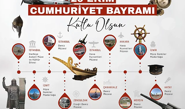 Milli Savunma Bakanlığı, 29 Ekim Cumhuriyet Bayramı dolayısıyla Türkiye genelindeki askerî müzelerin halka ücretsiz olarak açılacağını duyurdu. Bakanlık, tüm vatandaşları müzeleri ziyaret etmeye davet etti.ANKARA (İGFA) -Milli Savunma Bakanlığı (MSB), 29 Ekim Cumhuriyet Bayramı kapsamında yayımladığı açıklamada, Türkiye genelindeki askeri müzelerin vatandaşlara ücretsiz olarak açık olacağını duyurdu.Bakanlık açıklamasında vatandaşların Cumhuriyet Bayramı coşkusunu tarihi mirasla iç içe yaşayabilmeleri için müzelerde özel sergiler ve rehberli turların da düzenleneceğini belirtti.29 Ekim dolayısıyla ziyarete açılacak müzeler şöyle sıralandı: Ankara Hava Kuvvetleri Müzesi Çanakkale Deniz Müzesi Hatay Deniz Müzesi İstanbul Harbiye Askerî Müze ve Kültür Sitesi İstanbul Deniz Müzesi İstanbul Hava Kuvvetleri Müzesi İzmir Müze Gemiler Müdürlüğü İzmit Müze Gemiler Müdürlüğü Mersin Deniz Müzesi Zonguldak Ereğli Deniz Müzesi