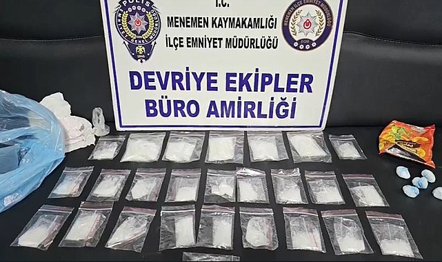 İzmir'in Menemen ilçesinde polisin devriye görevi esnasında şüphelenerek durdurduğu 3 kişinin üzerinden metamfetamin maddesi ele geçirildi. Olayla ilgili gözaltına alınan şüpheliler, çıkarıldıkları mahkemece tutuklandı.