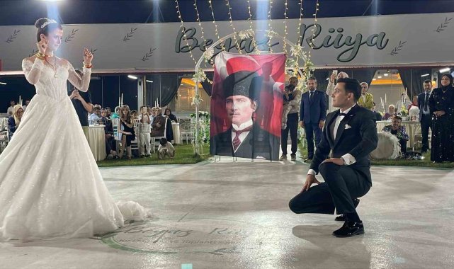 Sakarya'nın Pamukova ilçesinde 30 Ağustos Zafer Bayramı'nda dünyaevine giren çift, düğünlerinde sergiledikleri zeybek gösterisi ve açtıkları Atatürk posteri ile davetlilere unutulmaz anlar yaşattı.