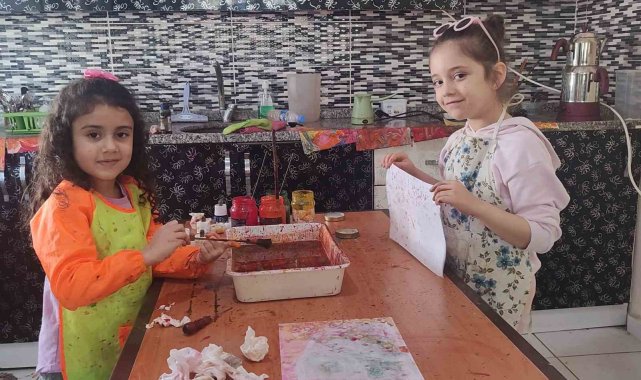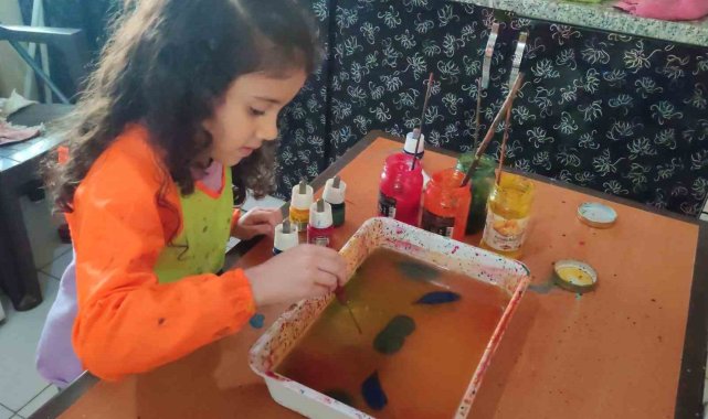 Kahramanmaraş'ta geleneksel ebru sanatına gönül veren minik sanatçılar, yaşlarından beklenmeyecek bir ustalıkla eserler ortaya koyuyor.Türkoğlu ilçesinde Kadın Akademisi Zafer Parkı'nda açılan ebru kursuna katılan 6 yaşındaki Ayşe Koç ve 7 yaşındaki Kevser Üstün, fırçalarını suya daldırıp renkleri dans ettirerek sanata hayat veriyor. Önlüklerini giyip ebru tezgâhının başına geçen minik ustalar, ailelerinin desteğiyle bu sanatta ilerliyor.Kevser Üstün, ebru yapmanın kendisini mutlu ettiğini belirterek, "Ben 7 yaşındayım. Ebru yapmayı ve ip atlamayı çok seviyorum. Bale öğretmeni olmak istiyorum. Ebru yaparken kendimi çok iyi hissediyorum ve bu kursa devam etmek istiyorum" dedi.Ayşe Koç ise ebru sanatına olan ilgisinin küçük yaşta başladığını dile getirerek, "Ebru yapmaktan çok hoşlanıyorum. 5 yaşında başladım, şu an 6 yaşındayım ve devam ediyorum. Annemler bana sürpriz yaparak beni kursa yazdırdı. Bir yıldır ebru yapıyorum ve çok mutluyum" ifadelerini kullandı.