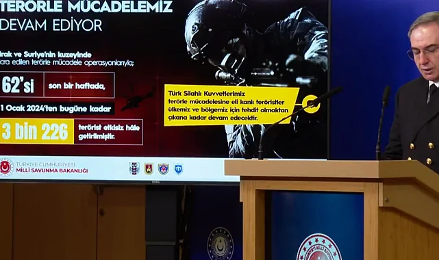 Milli Savunma Bakanlığı tarafından yurt içi ve sınır ötesinde gerçekleştirilen operasyonlarla Irak ve Suriye'nin kuzeyinde son bir haftada 62 teröristin etkisiz hale getirildiği belirtildi.ANKARA (İGFA) - Milli Savunma Bakanlığının faaliyetleri başta olmak üzere gündemdeki konulara ilişkin olarak Haftalık Basın Bilgilendirme Toplantısı gerçekleştirildi. Türk Silahlı Kuvvetlerinin, terörü kaynağında yok etme stratejisi çerçevesinde sürekli ve kapsamlı olarak operasyonlar gerçekleştirdiği belirtildi. 62'si son bir haftada olmak üzere 1 Ocak 2024'ten bugüne kadar 3 bin 226 terörist etkisiz hâle getirildi.https://twitter.com/tcsavunma/status/1879820112267751441