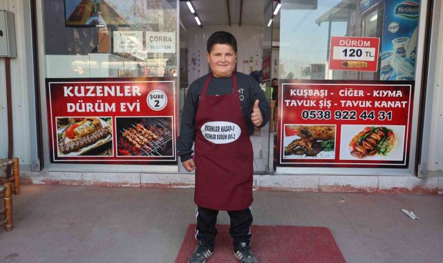 Hatay'da yarıyıl tatilini bir kebapçıda çıraklık yaparak geçiren 9 yaşındaki Adem Şölen, kendine has 'Kebaba gel, ciğere gel' değişiyle müşterilerin yüzünü gülümsetiyor.