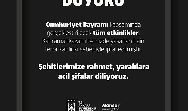 Ankara Büyükşehir Belediyesi (ABB), Cumhuriyet Bayramı kapsamında gerçekleştirilecek olan tüm etkinliklerin Ankara'nın Kahramankazan ilçesinde gerçekleşen terör saldırısı sebebiyle iptal edildiğini bildirdi.