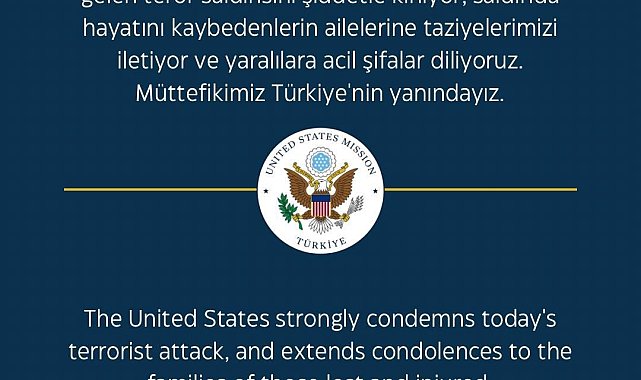 ABD'nin Ankara Büyükelçiliği, TUSAŞ'a düzenlenen terör saldırısını kınayarak, "Müttefikimiz Türkiye'nin yanındayız" açıklamasını yaptı.