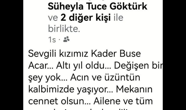 Antalya'nın Kemer ilçesinde 6 yıl önce meydana gelen hortum felaketinde kaybolan 20 yaşındaki üniversite öğrencisi Kader Buse Acar'ın annesi Ayla Acar, kızının kayboluşunun yıl dönümünde yaptığı paylaşımda yürekleri dağladı. Acılı anne, kızı Buse'nin fotoğrafları eşliğinde sosyal medya hesabından paylaştığı duygu dolu mesajda, "24 Ocak unutulmuyor Busem. Bu kadar derin yara açılır mı?" ifadelerine yer verdi.