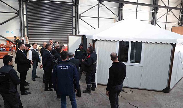 DÜZCE(İHA) – Düzce İl Özel İdaresi tarafından prototipi yapılan bal peteği modelli hibrit, çadır/konteyner görücüye çıktı. Hızlı kurulan, güvenli konaklama sağlayan konteyneri Vali Selçuk Aslan inceledi.Düzce Valisi Selçuk Aslan'ın 'Uluslararası Afet Lojistik ve Tedarik Fuarı'nda gördüğü, ülke şartlarına uyarlanması için talimat verdiği projenin, İl Özel İdaresi Çelik ve Ahşap Ürünleri İmalat Tesisi'nde Ar-Ge çalışmalarına başlandı.Hızlı kuruluyor, güvenli konaklama sağlıyorBu çalışmalar kapsamında, afet zamanlarında hızlı kurulum ve güvenli konaklama imkanı sunması hedeflenen bal peteği modelli hibrit konteyner/çadır prototipi üretimini inceleyen Vali Selçuk Aslan, proje hakkında yetkililerden bilgi aldı.