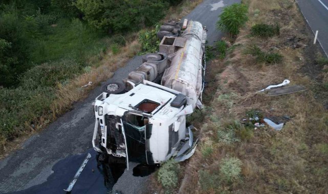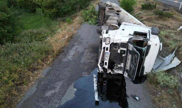 Afyonkarahisar'da sıcak asfalt yüklü tır devrildi