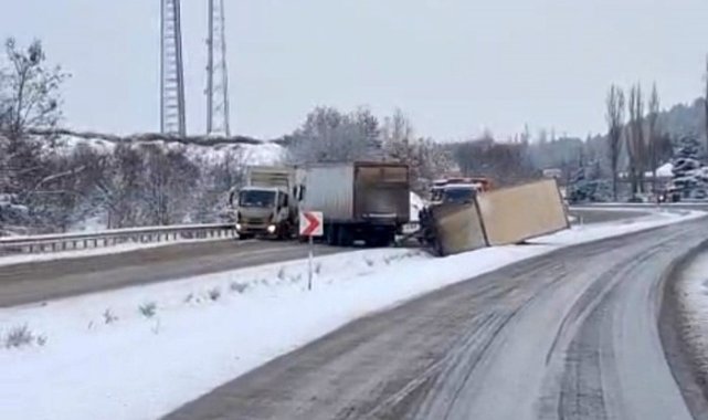 Karabük'te etkili olan kar yağışı nedeniyle ağaçlar devrilip yol kapanırken, kar nedeniyle kayan araçlarda kaza yaptı.Karabük-Bartın kara yolunun 1030 rakımlı Ahmetusta Geçidi'nde etkili olan kar yağışı sırasında, karla kaplanan bir çam ağacı yola devrildi. O sırada yoldan herhangi bir aracın geçmemesi, muhtemel bir kazanın önüne geçti. Devrilen ağaç nedeniyle yol trafiğe kapandı ve karla kaplı güzergahta araç kuyruğu oluştu. Yolda bekleyen sürücülerden biri, aracından çıkardığı motorlu testereyle ağacı kesti. Ağaç parçaları yol kenarına taşınırken, bölgede kar küreme ve tuzlama çalışması yapan Karayolları ekipleri kısa sürede olay yerine gelerek ağacı tamamen kaldırdı. Çalışmaların ardından trafik normale döndü.Kazalar peş peşe geldiSafranbolu ilçesi Kirkille Mahallesi'nde ise kar yağışı nedeniyle kayganlaşan yolda kontrolden çıkan kamyonet kanala düştü. Kazada ölen ya da yaralanan olmadı.Karabük'ü İstanbul ve Ankara'ya bağlayan D-100 kara yolunun Söğütlüçeşme mevkisinde ise refüjü aşarak karşı şeride geçen bir tırın dorselerinden biri devrildi. Aynı güzergahta yaklaşık 50 metre ileride bir kamyonet de yol kenarındaki su tahliye kanalına düştü. Kemikli rampalarında bir tır, önünde seyreden başka bir tıra çarptı. .Kazalarda ölen ya da yaralanan olmazken araçlarda maddi hasar oluştu.