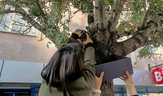 Ağaçtan aşağı inmeyen yavru kedi yaş mamayla ikna edildi