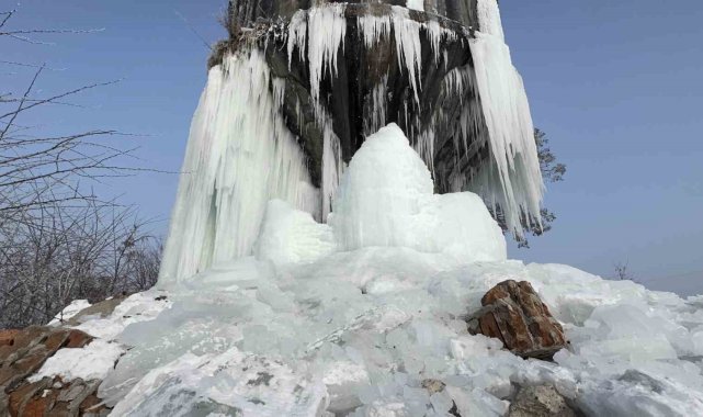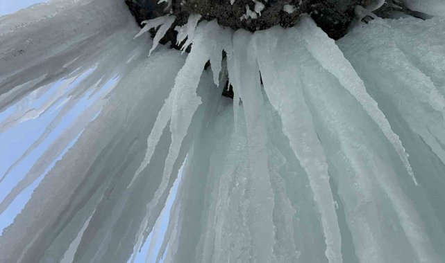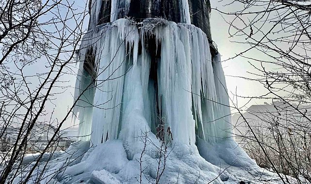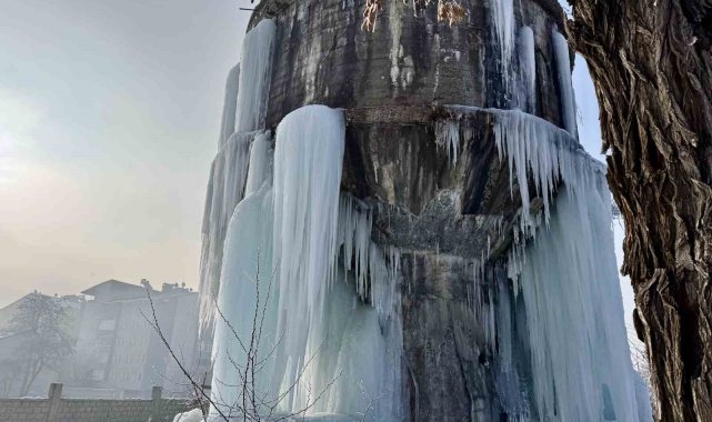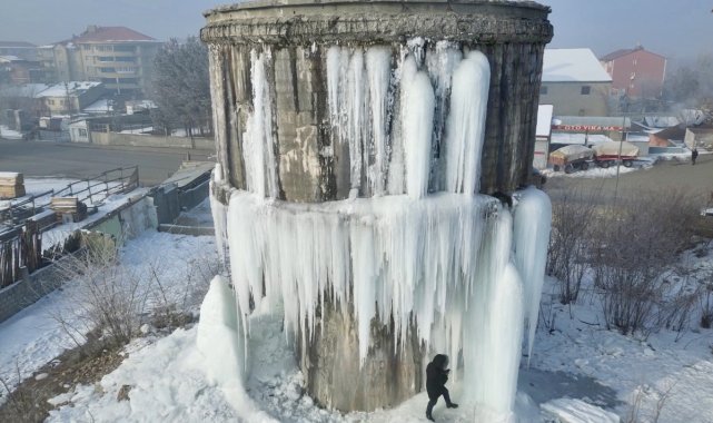 Ağrı'da etkili olan dondurucu soğuklar nedeniyle su deposu dondu, 15 metre uzunluğunda dev buz sarkıtları oluştu.