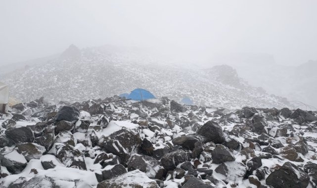 Ağrı Dağı'na zirve tırmanışı için harekete geçen dağcılar, 4 bin 200'de etkili olan kar ve tipinin ardından tırmanışa ara verdi.Ağrı'nın Doğubayazıt ilçesinde bulunan 5 bin 137 rakımlı Ağrı Dağı'nın yüksek kesimlerinde ve zirvesinde eylül ayına rağmen kar yağışı, fırtına ve yoğun sis etkisini sürdürüyor. Birçok dinde kutsal kabul edilen, terörden arındırıldıktan sonra yeniden tırmanışa açılan ve yılın her döneminde dağcı gruplarını ağırlayan Ağrı Dağı'na zirve tırmanışı gerçekleştirmek isteyen bir grup dağcı, 4 bin 200'de etkili olan kar ve tipinin ardından tırmanışa ara verdi.