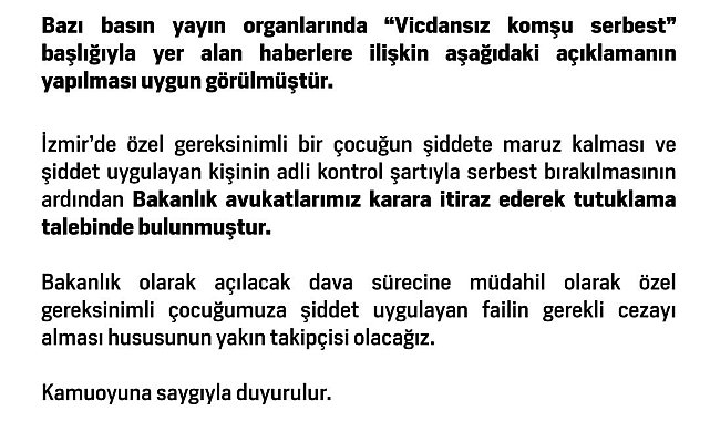 Bazı basın yayın organlarında "Vicdansız komşu serbest" başlığıyla yer alan haberlerin ardından Aile ve Sosyal Hizmetler Bakanlığı avukatları, adli kontrol şartıyla serbest bırakılan şahsın tutuklanması için talepte bulundu. Bakanlık tarafından yapılan yazılı açıklamada, "İzmir'de özel gereksinimli bir çocuğun şiddete maruz kalması ve şiddet uygulayan kişinin adli kontrol şartıyla serbest bırakılmasının ardından Bakanlık avukatlarımız karara itiraz ederek, tutuklama talebinde bulunmuştur. Bakanlık olarak açılacak dava sürecine müdahil olarak özel gereksinimli çocuğumuza şiddet uygulayan failin gerekli cezayı alması hususunun yakın takipçisi olacağız2 denildi.