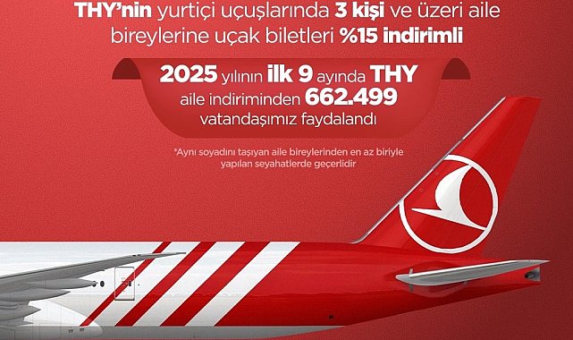 Aile ve Sosyal Hizmetler Bakanlığı, Aile Yılı'nda 662 bin 499 kişinin Türk Hava Yolları'nın (THY) yüzde 15 indirimli uçuş fırsatından yararlandığını bildirdi.Bakanlığın sosyal medya hesabından yaptığı paylaşımda, "Türk Hava Yollarının avantajlı biletleriyle, ailelerimiz gökyüzünde de birlikte. Aile Yılı'nda üç kişi ve üzeri aileler, THY'nin yurtiçi hatlarında yüzde 15 indirimli uçuyor. 2025 yılının ilk 9 ayında THY indiriminden 662 bin 499 vatandaşımız faydalandı" ifadeleri kullanıldı.