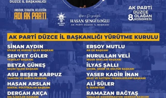 AK Parti Düzce Teşkilatında, İl Başkanı Hasan Şengüloğlu'nun yürütme kurulu belli oldu. İl Başkanı Şengüloğlu "Şehrimize ve milletimize hizmet yolunda sorumluluk üstlenen bu güçlü kadromuza birlik ve beraberlik içinde çalışmayı nasip etsin" dedi.AK Parti Düzce 8. Olağan İl Kongresinde il başkanı olarak seçilen Hasan Şengüloğlu mazbatasını aldıktan sonra yönetim kurulu ile ilk toplantısını gerçekleştirdi. Daha güçlü daha güzel bir Düzce için kararlılıkla çalışmalarını sürdüreceklerinin altını çizen Şengüloğlu, "22 yıldır milletimizin gönlünde taht kurmuş, hizmet siyasetiyle Türkiye'yi adeta yeniden inşa etmiş bir hareketin mensupları olarak, yeni dönemde de şehrimize ve ülkemize en güzel şekilde hizmet etmeye devam edeceğiz. Cumhurbaşkanımız ve Genel Başkanımız Recep Tayyip Erdoğan'ın liderliğinde, 'Durmak yok, yola devam' diyerek, Düzce'miz için daha büyük hedefler belirledik. AK Parti olarak, milletimizin güvenine layık olmak, her alanda güçlü adımlar atmak ve gönülleri kazanmaya devam etmek için durmadan çalışacağız. Daha güçlü bir Türkiye, daha güzel bir Düzce için hep birlikte aynı azim ve kararlılıkla yolumuza devam ediyoruz" dedi.Yönetim kurulu şu isimlerden oluştu;Siyasi ve Hukuki İşler Başkanı Sinan Aydın, Teşkilat Başkanı Servet Güler, Seçim İşleri Başkanı Beyza Güneş, Tanıtım ve Medya Başkanı Asu Beşer Karpuz, Sosyal Politikalar Başkanı Hasan Arslan, Dış İlişkiler Başkanı Dergah Akça, AKİM Başkanı Yunus Emre Gülay, Yerel Yönetimler Başkanı Alaattin Baş, Ekonomi İşleri Başkanı Ümit Yıldırım, Sivil Toplum ve Halkla İlişkiler Başkanı Aydın Çetinkaya, Mali ve İdari İşler Başkanı Fatma Ayten Büyükaydın, ArGe Başkanı Ersoy Mutlu, İnsan Hakları Başkanı Nurullah Veli, Çevre, Şehir ve Kültür Başkanı İlyas Şallı, Bilgi ve İletişim Teknolojileri Başkanı Yaser Kadir İnan, İl Sekreteri Ali Süler, Yaşlılar Koordinasyon Merkezi Başkanı Ramazan Bağtaş, Engelliler Koordinasyon Merkezi Başkanı Kutlu Gökesaoğlu, Şehit ve Gazi Aileleri Koordinasyon Merkezi Başkanı Mustafa Bilgin.