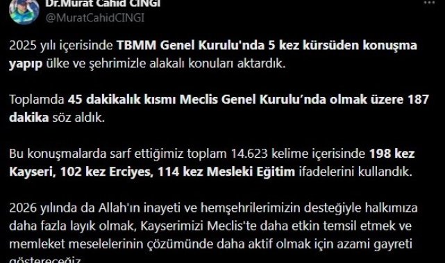 AK Parti Kayseri Milletvekili Murat Cahid Cıngı, yaptığı sosyal medya paylaşımı ile 2025 yılı meclis faaliyetlerini açıkladı.