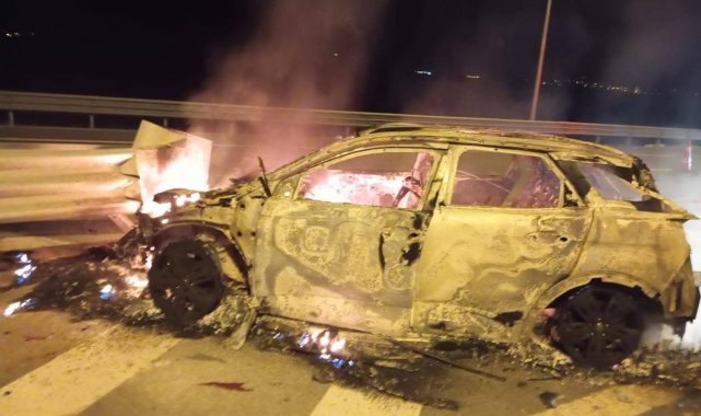 Aksaray'da bariyerlere çarparak duran otomobilde 3 kişi yaralandı. Kaza sonrası alev alev yanan araç demir yığınına döndü.