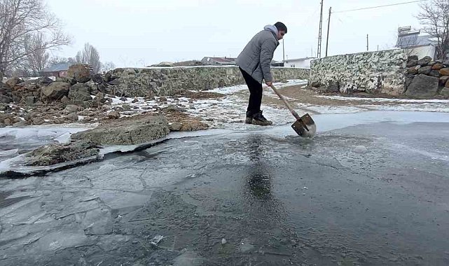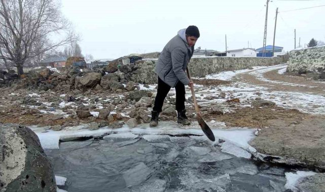 Kars'ın Akyaka ilçesinde etkili olan dondurucu soğuklar hayatı olumsuz yönde etkiliyor. Geceleri eksi 15 derecelere kadar düşen hava sıcaklıkları, bölgede bulunan dereleri dondurdu. Çiftçiler, hayvanlarının su ihtiyacını karşılamak için yoğun çaba gösteriyor.Sabahın erken saatlerinde donmuş derelere giden çiftçiler, ellerindeki küreklerle buzları kırarak suya ulaşmaya çalışıyor.Donmuş derelerin buzlarını kıran çiftçiler ahırlarındaki hayvanları dereye getirerek hayvanların su ihtiyacını karşılıyor. Çiftçiler daha sonra hayvanlarını ahırlarına götürüyor.