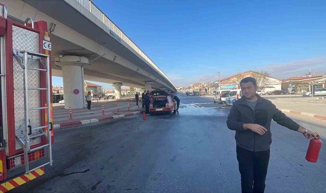 Karaman'da seyir halindeyken motor kısmından alev alan LPG'li otomobile ilk müdahaleyi polis ekibi yaptı.