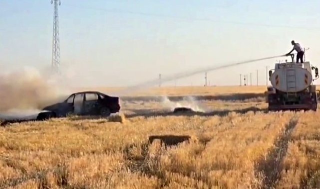 Alev alev yanan otomobil tarlayı da yaktı