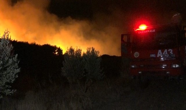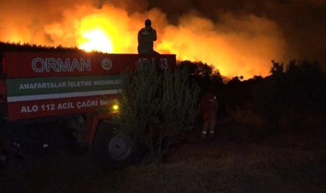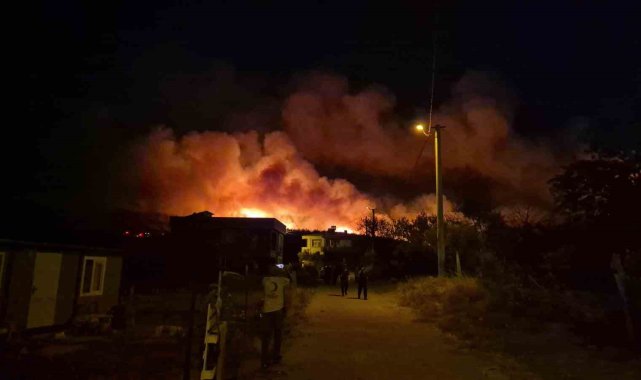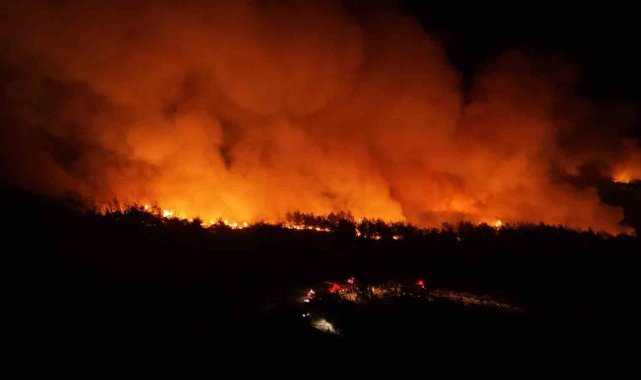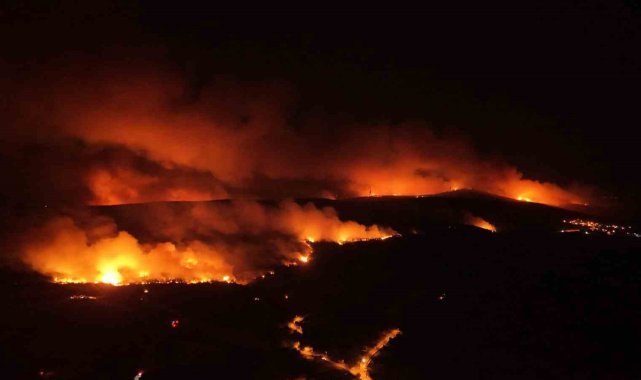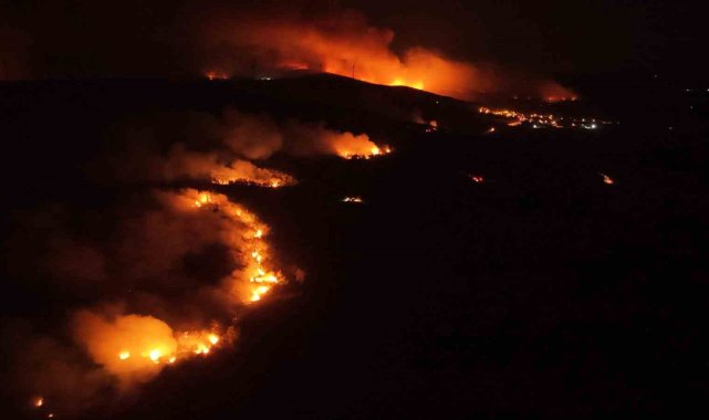 Tekirdağ'ın Şarköy ilçesinde dün başlayan orman yangını sürerken, alevlerin tehdit ettiği 3 köy boşaltıldı. Geceyi gündüze çeviren alevler dron ile havadan görüntülendi.
