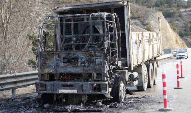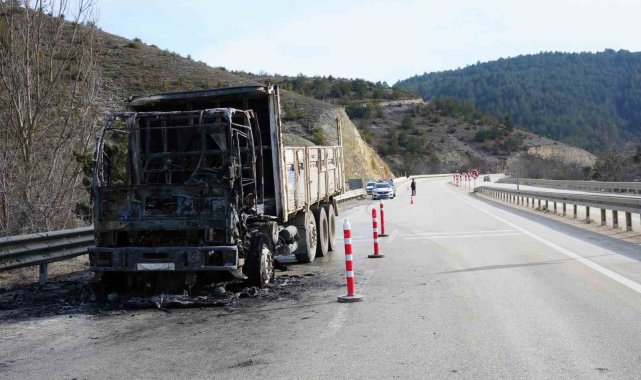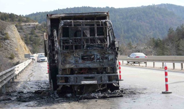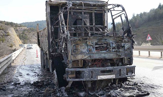 Kastamonu'da seyir halindeyken alevlere teslim olan kamyondan geriye demir yığını kaldı.