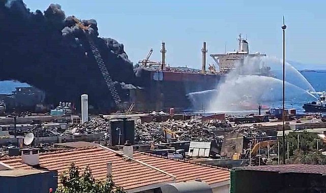 İzmir'in Aliağa ilçesinde hurda gemilerinin geri dönüştürüldüğü gemi söküm bölgesinde, Libya'dan gelen Sloug adlı gemide söküm çalışmaları sırasında başlayan yangın devam ediyor.