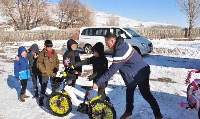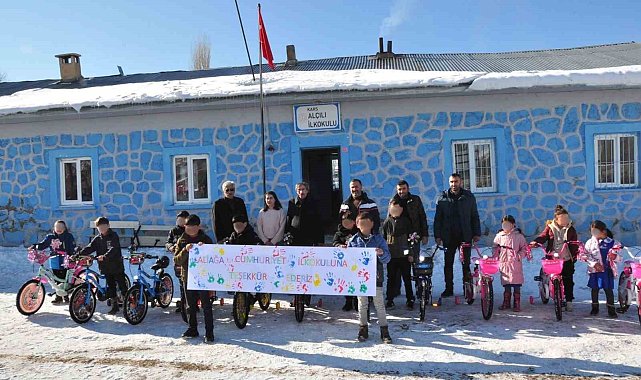 Aliağa Cumhuriyet İlkokulu'nun hayata geçirdiği "Velespitim Pırıl Pırıl" projesi kapsamında, Iğdır, Ardahan ve Kars'taki öğrencilere toplam 42 adet bisiklet hediye edildi.