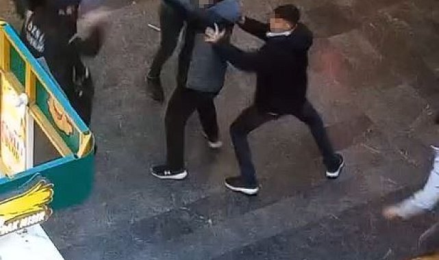 Alışveriş merkezinde güvenlik görevlileri ile gençler arasında tekme tokat kavga kamerada