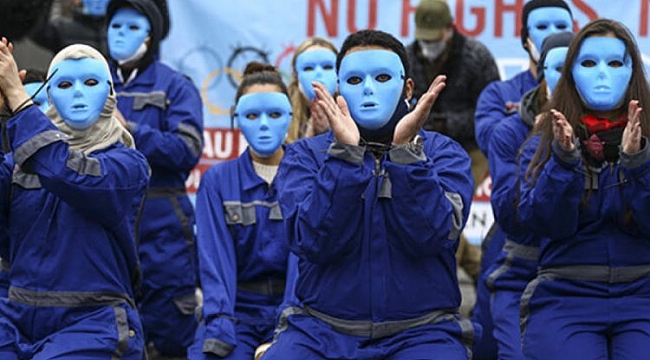 Ellerini de kelepçeleyen göstericiler, Pekin'de düzenlenecek 2022 Kış Olimpiyat Oyunlarının boykot edilmesini istedi, "No Rights, No Games" (hukuk yoksa oyunlar da yok) yazılı pankart açtı.