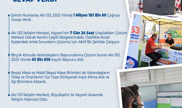 Kayseri Büyükşehir Belediyesi; yerel yönetim hizmetlerinin en etkin ve en verimli şekilde vatandaşa ulaşması ve belediyenin daha erişilebilir olması noktasında Alo 153 İletişim Merkezi ile 7 gün 24 saat Kayserililere hizmet veriyor. Şehrin Numarası Alo 153, 2025 yılında 1 milyon 193 bin 60 çağrıya cevap verdi.