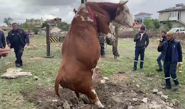 Amasya'da çukura düşen inek vinç yardımıyla kurtarıldı