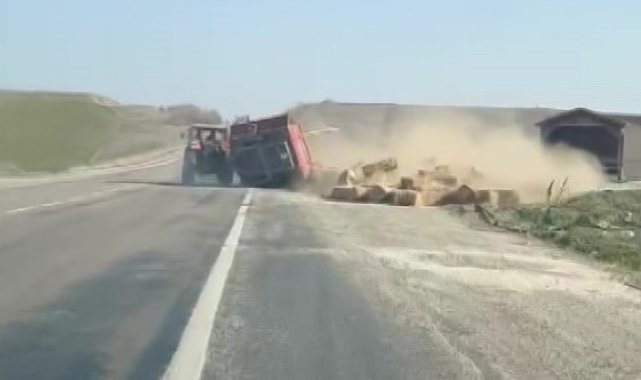 Amasya'da seyir halindeki saman yüklü traktörün römorku yan yatarak devrildi. Balyaların yola dağıldığı o anlar cep telefonu kamerasıyla saniye saniye görüntülendi.