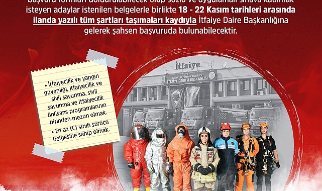 Ankara Büyükşehir Belediyesi KPSS puanıyla 300 itfaiye eri alımı yapacağını açıkladı. Adayların istenilen belgelerle birlikte 18-22 Kasım tarihleri arasında İtfaiye Daire Başkanlığına gelerek şahsen başvurmaları gerekiyor.