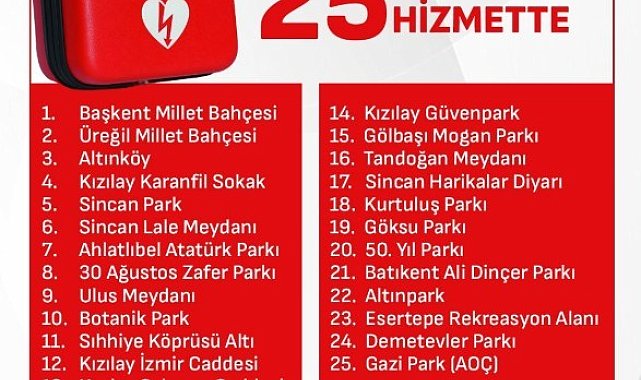 Ankara Valiliği, ani gelişen kalp durmaları vakalarına karşı Otomatik Eksternal Defibrilatör (OED) şok cihazlarının belirlenen 25 noktaya yerleştirildiğini açıkladı.