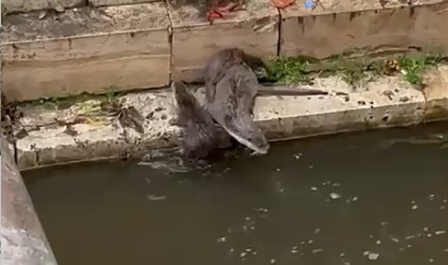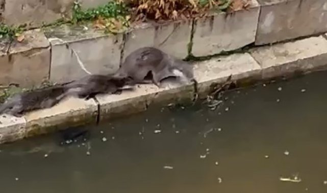 Tokat'ta bir vatandaşın sabah işe giderken görüntülediği su samuru ailesi izleyenleri gülümsetti.