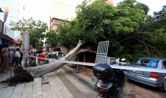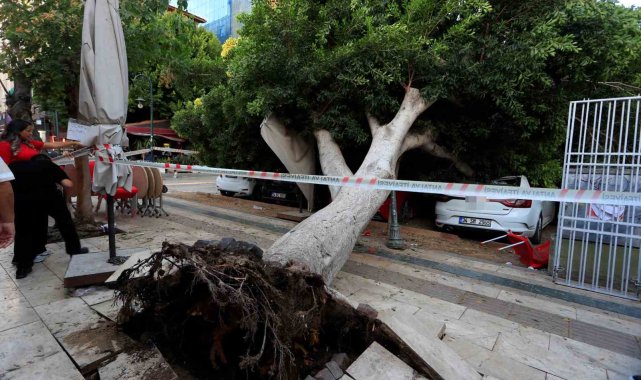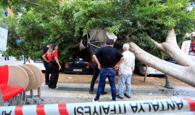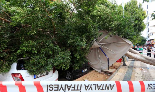 Antalya'da kaldırım üzerinde bulunan ağaç park halindeki araçların üzerine devrildi. 5 araçta büyük çapta maddi hasar meydana gelirken, bir kişi ağaç dallarının altında kalmakta son anda kurtuldu.