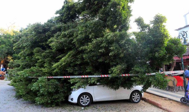 Antalya'da faciadan dönüldü: Araçların üzerine devrilen ağacın altında kalmaktan son anda kurtuldu