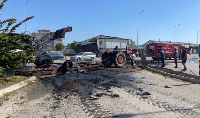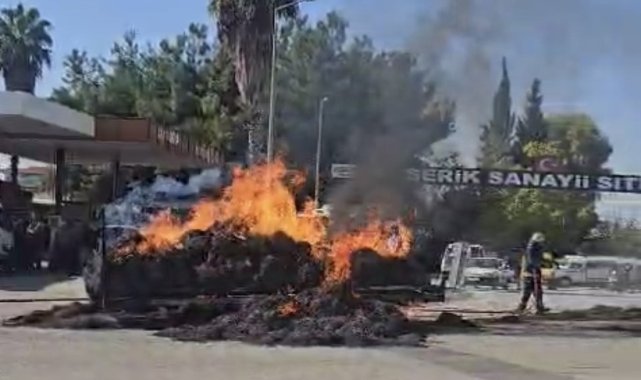 Antalya'nın Serik ilçesinde seyir halindeki traktörde bulunan saman balyaları yanarak küle döndü. Sürücü traktörü yanmaktan son anda kurtardı.