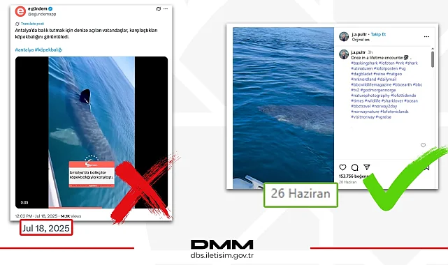 İletişim Başkanlığı, sosyal medyada "Antalya'da köpekbalığı görüldü" iddiasıyla paylaşılan videonun Norveç'te çekildiğini açıkladı. Dezenformasyonla Mücadele Merkezi'nden yapılan açıklamada, turizmi hedef alan dezenformasyona karşı suç duyurusu yapılacağı bildirildi.