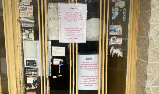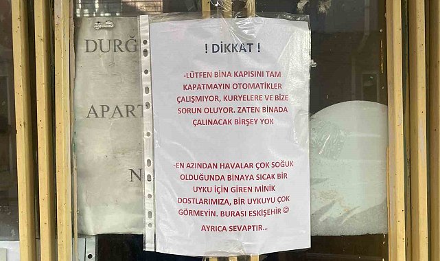 Eskişehir'de bir apartman kapısına, "Lütfen bina kapısını tam kapatmayın, otomatikler çalışmıyor. Zaten binada çalınacak bir şey yok" yazılı mesaj yapıştırıldı.Hoşnudiye Mahallesi Müderris Sokak üzerinde bir apartman kapısına yazılan ilginç yazı dikkat çekti. Bina sakinleri tarafından kapıya yapıştırılan, "Lütfen bina kapısını tam kapatmayın, otomatikler çalışmıyor. Kuryelere ve bize sorun oluyor. Zaten binada çalınacak bir şey yok. En azından havalar çok soğuk olduğunda binaya sıcak bir uyku için giren minik dostlarımıza bir uykuya çok görmeyin. Burası Eskişehir. Ayrıca sevaptır" yazılı mesaj göze çarptı. Farkındalık içeren mesaj görenleri hem güldürdü hem de düşündürdü.Öte yandan, apartmanda çalınacak bir şey olmadığı belirtilmesine rağmen bir dairenin önündeki damacanın üzerinde 100 TL bulunduğu görüldü.