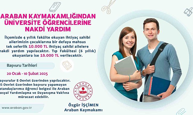 Gaziantep Araban Kaymakamlığı, ilçedeki ihtiyaç sahibi ailelerin 4 yıllık fakülte öğrencilerine 10 bin TL, tıp fakültesi öğrencilerine ise 15 Bin TL nakdi yardım yapılacağını açıkladı.Araban Kaymakamı Özgür İşçimen, ihtiyaç sahibi ailelerin üniversite okuyan öğrencilerine tek seferlik nakdi yardım yapılacağını açıkladı. Kaymakam İşçimen, yaptığı açıklamada, "İlçemizde 4 yıllık fakülte okuyan ihtiyaç sahibi ailelerin çocuklarına bir defaya mahsus 10 bin TL nakdi yardım yapılacak. Tıp fakültesi (6 yıllık) okuyan öğrencilere ise yine tek seferlik 15 bin TL nakdi yardım yapılacak. Başvurular 20 Ocak-10 Şubat 2025 tarihleri arasında E-devlet üzerinden yapılacak. E-devlet üzerinden başvuru yapamayan vatandaşlarımız ise öğrenci belgesi ile Araban Sosyal Yardımlaşma ve Dayanışma Vakfına müracaat edebilir" ifadelerini kullandı.