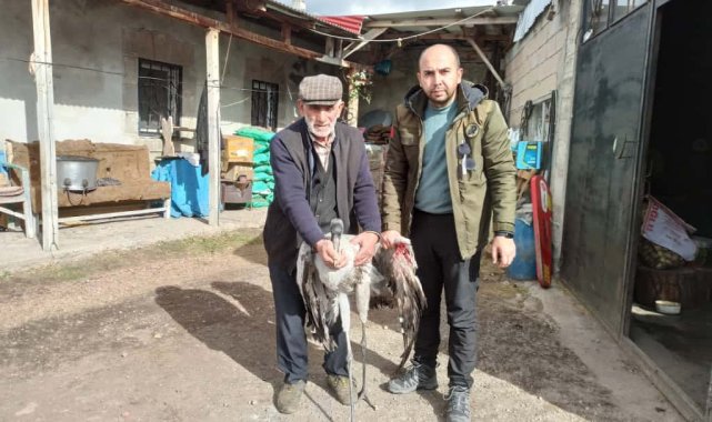 Ardahan'da kanadından yaralı halde arazide bulunan turna kuşu, tedavi altına alındı.