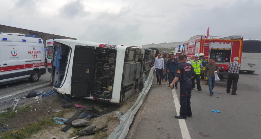 Samsun|da acemi askerleri taşıyan yolcu otobüsünün devrildiği kazada çok sayıda kişi yaralandı. Yaralılardan 15|i Samsun|daki hastanelere sevk edildi, diğerleri Kavak Devlet Hastanesinde ayakta tedavi edildi. Yaralılardan 3|ünün durumunun ağır olduğu öğrenildi