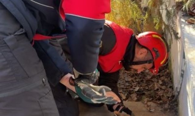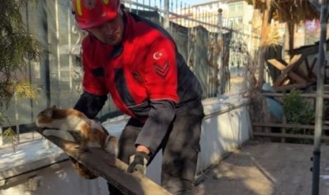 Ayağı tahtaların arasına sıkışan kedinin yardımına itfaiye koştu