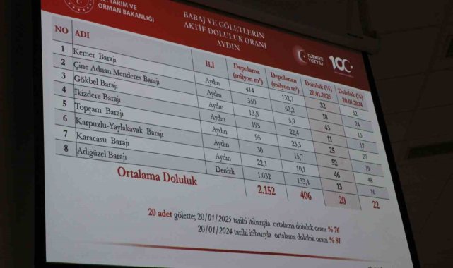 Önemli tarım kentlerinden olan Aydın'da çiftçilerin can damarı olan barajların doluluk seviyeleri belli oldu. Geçtiğimiz yıl 20 Ocak tarihinde yüzde 22 olan doluluk seviyesi bu yıl yüzde 20 oldu.Çiftçi sayısı yüksek olan illerden olan Aydın'da üreticilerin merakla takip ettiği barajlardaki doluluk oranlarının Ocak ayı rakamları belli oldu. Aydın İl Koordinasyon Kurulu Toplantısı'nda yapılan sunuma göre Aydın genelinde 20 Ocak 2024 yılında yüzde 22 olan doluluk seviyesi 20 Ocak 2025 yılında yüzde 22 oldu. Ayrıca Aydın'ın, uzun yıllar ortalaması 661 milimetre ile Türkiye ortalamasının üzerinde olurken, 2024 yılında ise 507 milimetre ile Türkiye ortalamasının altında yağış aldığı ifade edildi.Paylaşılan verilere göre, 414 milyon metreküp depolama hacmi olan Kemer Barajı'nda 20 Ocak 2024 tarihinde yüzde 32 olan doluluk oranı, 20 Ocak 2025 tarihinde yüzde 32 oldu. 350 milyon metreküp depolama hacmi olan Çine Adnan Menderes Barajı'nda 20 Ocak 2024 tarihinde yüzde 24 olan doluluk oranı, 20 Ocak 2025 tarihinde yüzde 18 oldu. 13 milyon metreküp depolama hacmi olan Gökbel Barajı'nda 20 Ocak 2024 tarihinde yüzde 13 olan doluluk oranı, 20 Ocak 2025 tarihinde yüzde 43 oldu. 195 milyon metreküp depolama hacmi olan İkizdere Barajı'nda 20 Ocak 2024 tarihinde yüzde 17 olan doluluk oranı, 20 Ocak 2025 tarihinde yüzde 11 oldu. 95 milyon metreküp depolama hacmi olan Topçam Barajı'nda 20 Ocak 2024 tarihinde yüzde 27 olan doluluk oranı, 20 Ocak 2025 tarihinde yüzde 25 oldu. 30 milyon metreküp depolama hacmi olan Karpuzlu-Yaylakavak Barajı'nda 20 Ocak 2024 tarihinde yüzde 79 olan doluluk oranı, 20 Ocak 2025 tarihinde yüzde 52 oldu. 22 milyon metreküp depolama hacmi olan Karacasu Barajı'nda 20 Ocak 2024 tarihinde yüzde 48 olan doluluk oranı, 20 Ocak 2025 tarihinde yüzde 46 oldu.Ayrıca 20 adet gölette 20 Ocak 2024 tarihinde yüzde 81 olan ortalama doluluk oranı, 20 Ocak 2025 tarihinde yüzde 76 oldu.