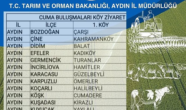 Aydın Tarım ve Orman Müdürlüğü tarafından 'Tarım Sahada' projesi kapsamında düzenlenen Cuma buluşmalarıyla üreticilerle doğrudan temas kurulmaya edilirken, yetkililer vatandaşlarla bir araya geliyor.Aydın il genelinde 24 Nisan 2026 Cuma günü saat 14.00'te Aydın genelinde eş zamanlı gerçekleştirilecek programlarda, çiftçilerin talep ve önerileri yerinde dinlenecek. Tarımın kalbi olan köylerde düzenlenecek buluşmalarda; bitkisel ve hayvansal üretim, verimlilik, desteklemeler ve sahadaki sorunlar ele alınacak. Yetkililer, üreticilerle birebir görüşerek çözüm odaklı istişarelerde bulunacak. Program kapsamında birçok ilçede belirlenen köylerde toplantılar yapılacak. Buna göre Bozdoğan'da Çarşı, Çine'de Kahramanköy, Didim'de Balat, Efeler'de Kadıköy, Germencik'te Turanlar, İncirliova'da Hamitler, Karacasu'da Güzelbeyli, Karpuzlu'da Ömerler, Koçarlı'da Halilbeyli, Köşk'te Cumadere, Kuşadası'nda Kirazlı, Kuyucak'ta Yaylalı, Nazilli'de Toygar, Söke'de Çalıköy, Sultanhisar'da Demirhan ve Yenipazar'da Doğu mahallelerinde çiftçilerle bir araya gelinecek.Aydın Tarım ve Orman Müdürlüğü'nden yapılan açıklamada üretimin sürdürülebilirliği ve verimliliğin artırılması için sahada olmanın önemine dikkat çekerek, "Üreten, alın teriyle toprağa değer katan tüm çiftçilerimizi buluşmalarımıza bekliyoruz. Tarım sahada, üreticimizin yanında" ifadelerine yer verildi.