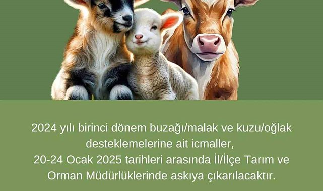 Aydın İl Tarım ve Orman Müdürlüğü'nden 2024 yılı birinci dönem buzağı/malak ve kuzu/oğlak desteklemeleri için yapılan duyuruda, icmallerin 20-24 Ocak 2025 tarihleri arasında İl ve İlçe Tarım ve Orman Müdürlüklerinde askıya çıkarılacağı bildirildi.